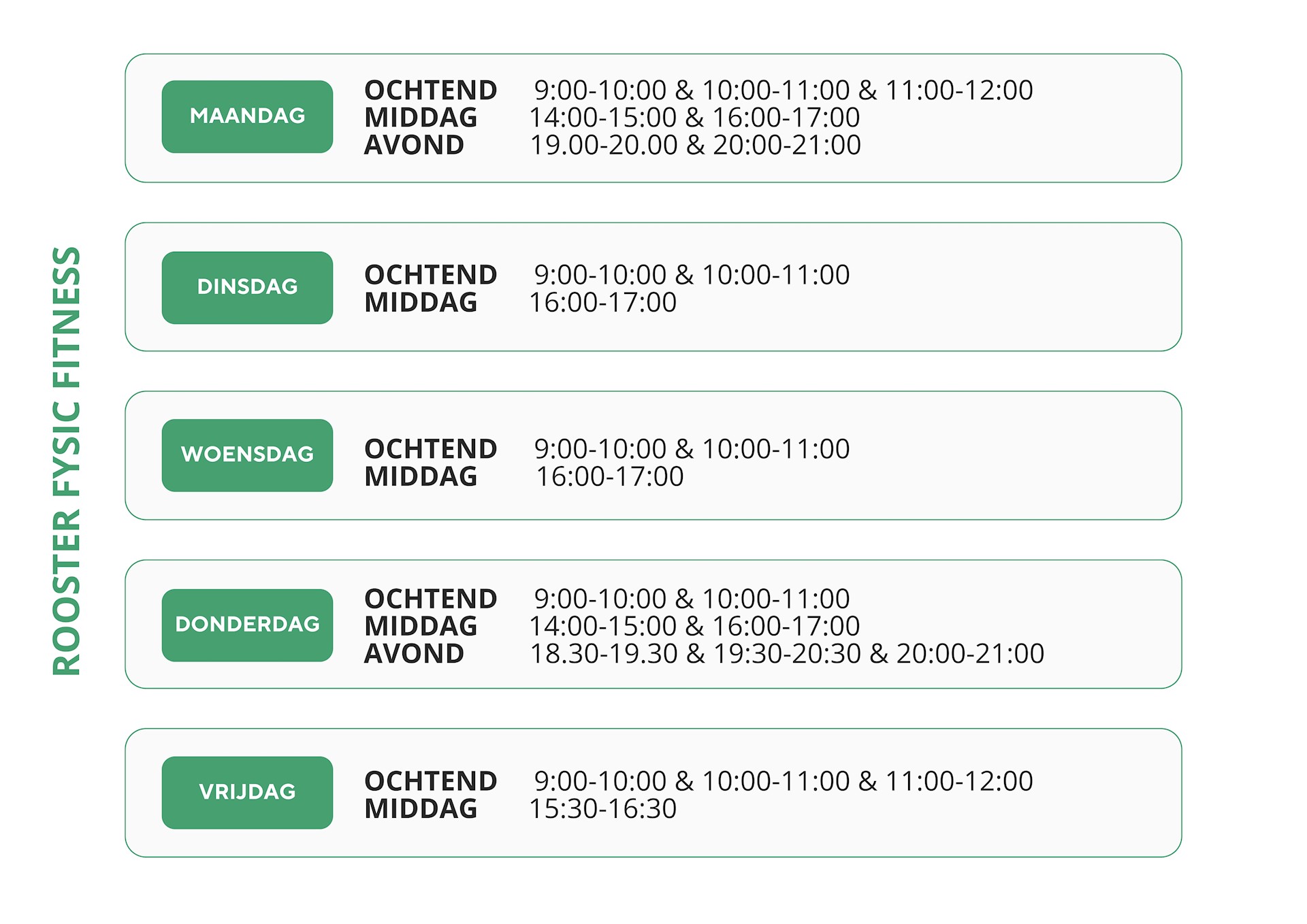 Op de volgende dagen en tijden bieden we Fysic Fitness aan (onder voorbehoud):